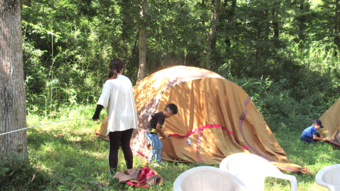 テントは家族ごとにたてるので、家族のみんなで作業を分担してたてられるとすてきですね。テントのたて方や、道具の使い方などはスタッッフがわかりやすく説明しますので安心です。