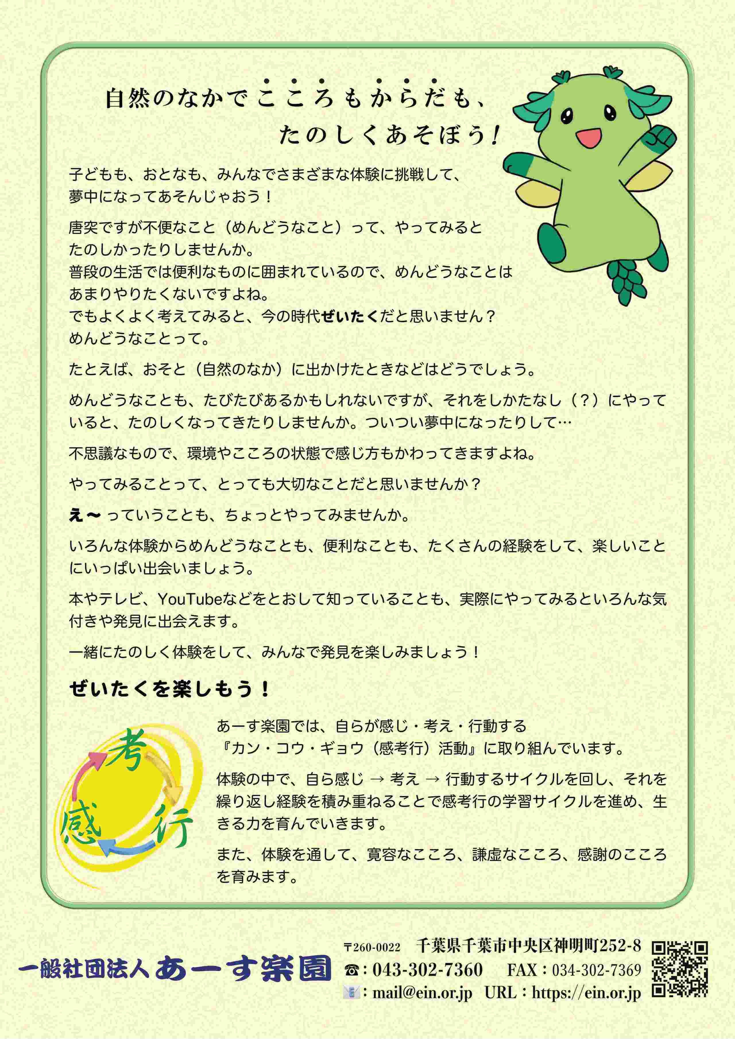 あーす楽園では、自らが感じ・考え・行動する『カン・コウ・ギョウ(感考行)活動』に取り組んでいます。